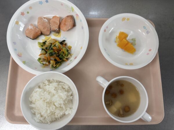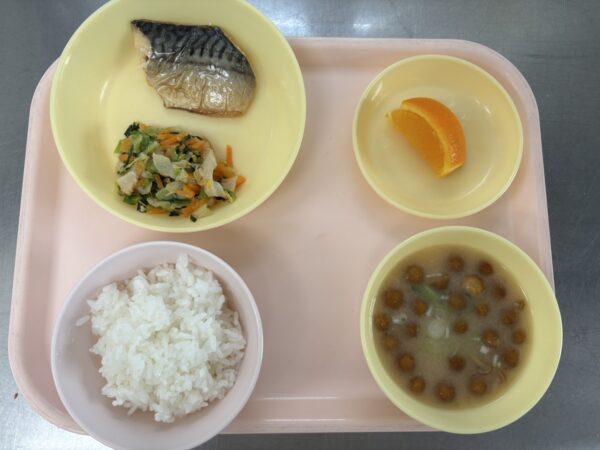 さばの塩焼き 今日の給食は、ごはん・なめこ汁(なめこ、豆腐、ねぎ)・さばの塩焼き・ごま和え・オレンジです。 【以上児さん】 ごはん・なめこ汁(なめこ、豆腐、ねぎ)・鮭の甘塩焼き・ごま和え・オレンジです。 【未満児さん】