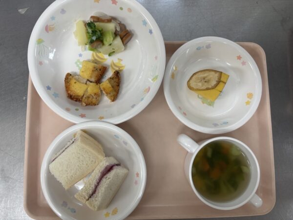 食パン(ブルーベリージャム)・コンソメスープ(人参、コーン、チンゲン菜)・チキンのチーズ焼き・ジャーマンポテト・バナナです。