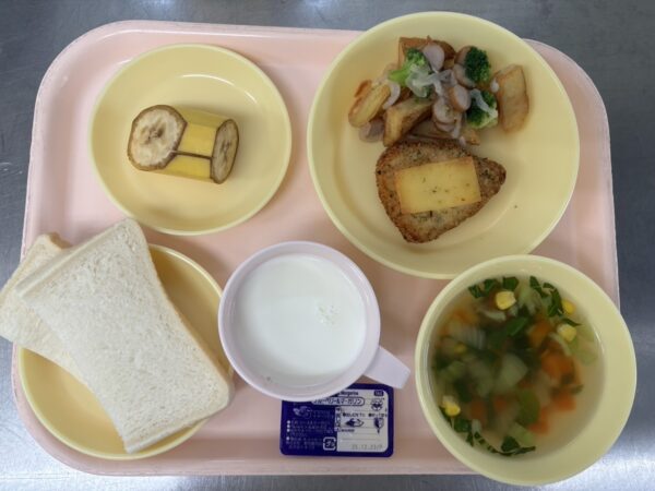 今日の給食は、食パン(ブルーベリー&マーガリン)・コンソメスープ(人参、コーン、チンゲン菜)・チキンのチーズ焼き・ジャーマンポテト・バナナ・牛乳です。