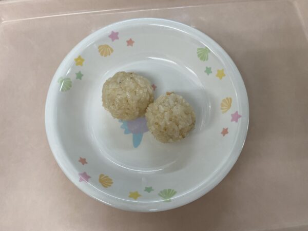 未満児さんの午後のおやつは、しらすおにぎりです。