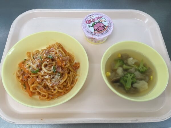 今日の給食は、ナポリタンスパゲティ・花野菜スープ(ブロッコリー、カリフラワー、しめじ、コーン)・フルーツゼリー(未満児さんはヨーグルト)です。