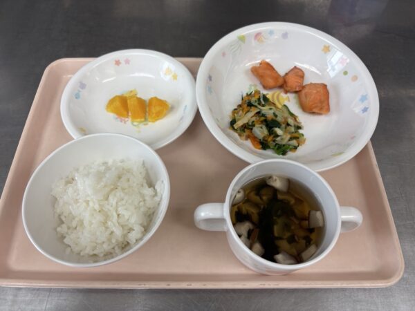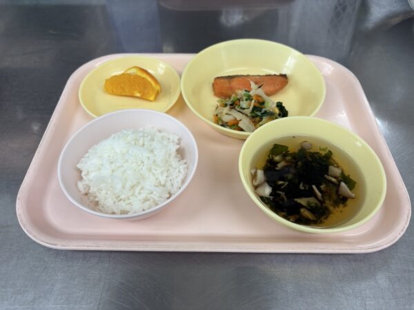 今日の給食は、ごはん・すまし汁(わかめ、しいたけ)・鮭の西京焼き・ちくわ和え・オレンジです。