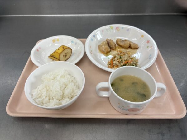 今日の給食は、ごはん・みそ汁(じゃが芋、小松菜)・イワシの甘露煮(未満児さんは赤魚の煮つけ)・バンバンジーサラダ・バナナです。