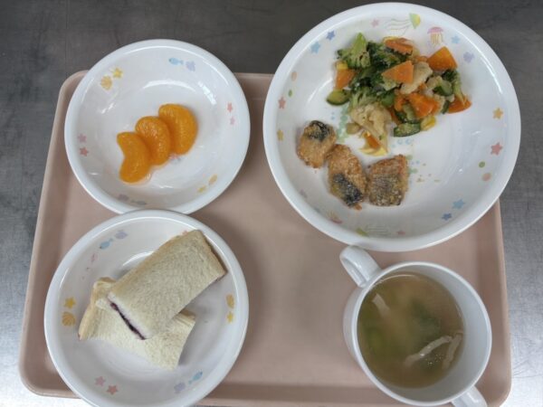 今日の給食は、食パン(ブルーベリー&マーガリン)・アスパラのスープ(ベーコン、アスパラ、玉ねぎ)・サーモンフライ・中華ごまサラダ・みかんゼリー・牛乳です。
