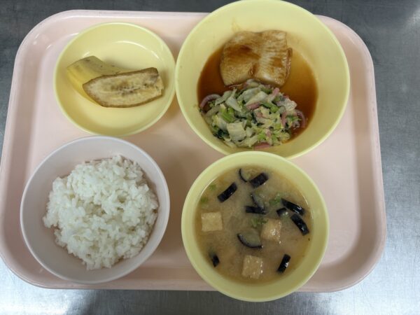 今日の給食は、ごはん・みそ汁(なす、厚揚げ、大根)・カレイの照り焼き・ごま和え・バナナです。