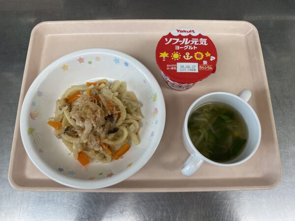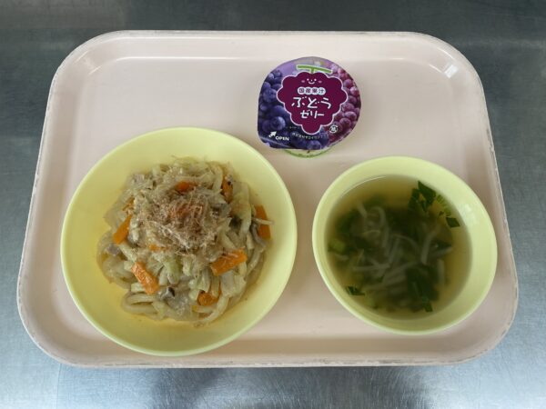 今日の給食は、焼きうどん・もやしスープ(もやし、コーン、チンゲン菜)・フルーツゼリー(未満児さんは鉄分ヨーグルト)です。