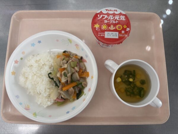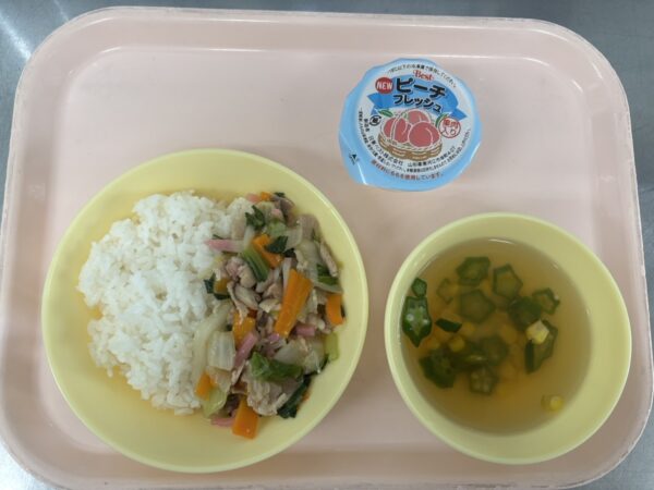 今日の給食は、中華丼・オクラのスープ(オクラ、コーン)・フルーツゼリー(未満児さんは鉄分ヨーグルト)です。