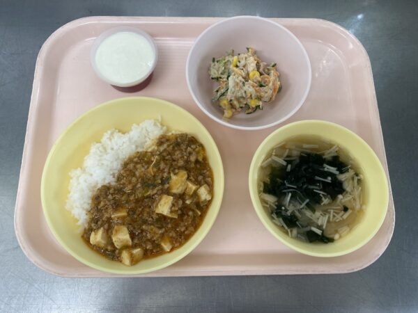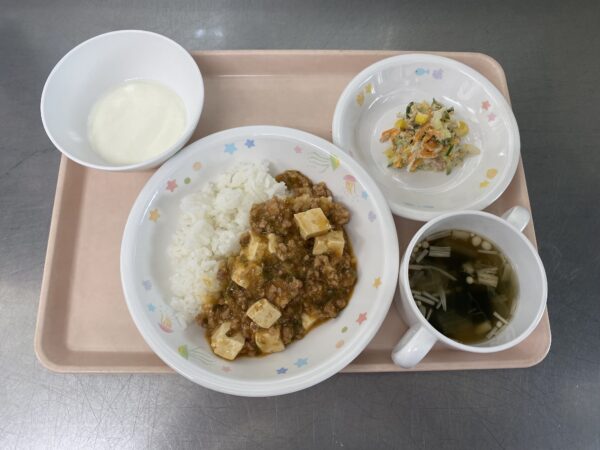 今日の給食は、麻婆丼・わかめスープ(わかめ、えのき、玉ねぎ)・ツナサラダ・ぶどうゼリーヨーグルトのせ(未満児さんはヨーグルト)です。