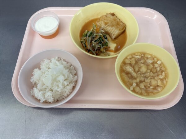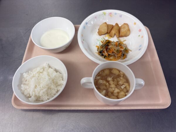 今日の給食は、ごはん・みそ汁(切干大根、油揚げ)・カレイの照り焼き・なめたけ和え・オレンジゼリーヨーグルトのせ(未満児さんはヨーグルト)です。