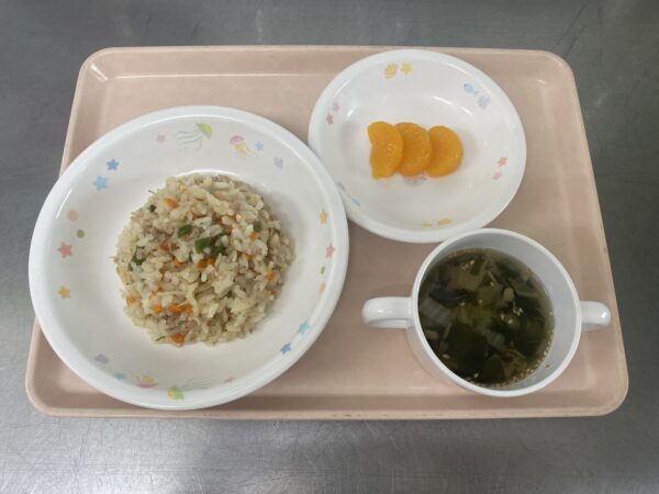 未満児さんの今日の給食は、しらすチャーハン・具だくさんスープ(わかめ、白菜、えのき、いりごま)・みかん缶です。