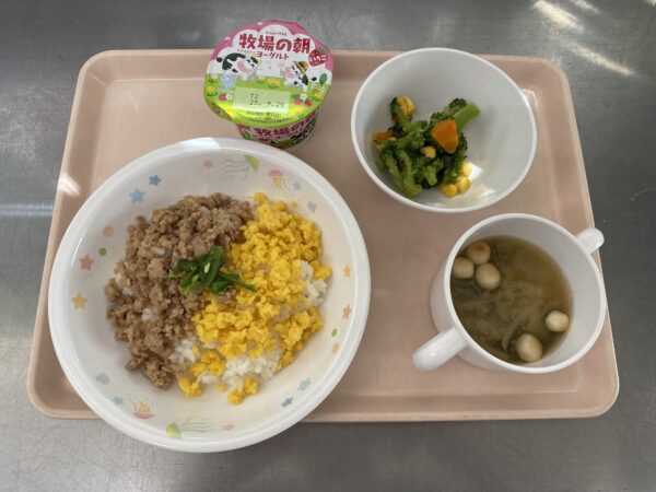 今日の給食は、二色丼・みそ汁(わかめ、玉ねぎ、豆麩)・おかか和え・ヨーグルトです。
