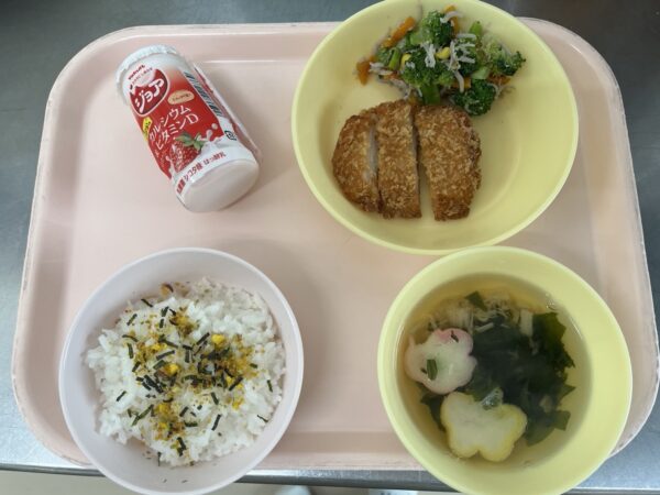 今日の給食は、のりたまごはん・すまし汁(わかめ、えのき、花麩)・みそカツ・しらす和え・ジョアです。