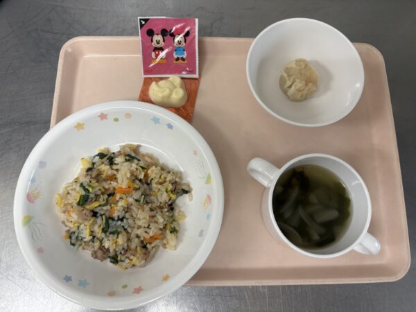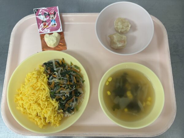 今日の給食は、ビビンバ・わかめスープ(わかめ、玉ねぎ、コーン)・えびしゅうまい・ディズニーチーズです。