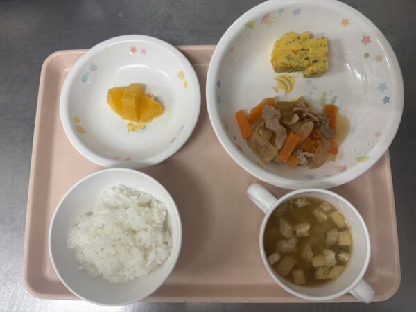 ごはん・みそ汁(さつま芋、油揚げ、小松菜)・豚の旨煮・彩り野菜の卵焼き・オレンジです。