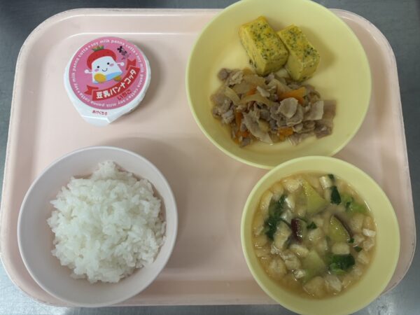 今日の給食は、ごはん・みそ汁(さつま芋、油揚げ、小松菜)・豚の生姜焼き・彩り野菜の卵焼き・豆乳パンナコッタ(いちご)です。