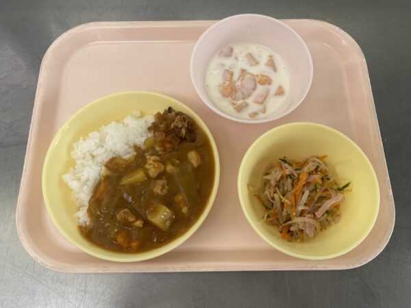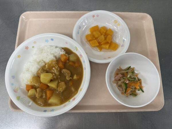今日の給食は、チキンカレー・春雨サラダ・フルーツヨーグルト(ヨーグルト、みかん缶、黄桃缶)(未満児さんは黄桃缶)です。