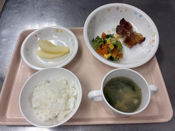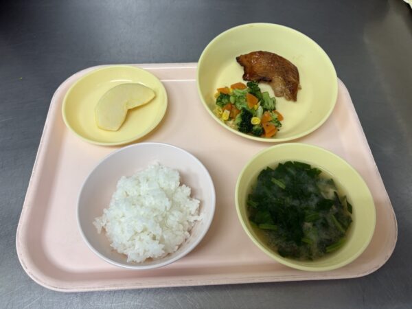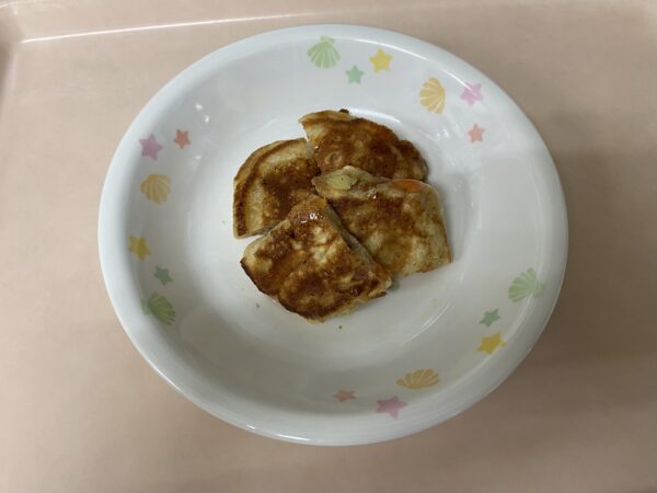 赤魚の幽庵焼き 今日の給食は、ごはん・みそ汁(えのき、高野豆腐、ほうれん草)・赤魚の幽庵焼き・おかか和え・りんごです。 【以上児さん】 【未満児さん】 未満児さんの午後の手作りおやつは、バナナキャロットホットケーキです。
