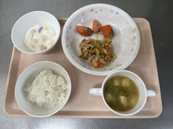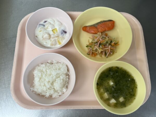 今日の給食は、ごはん・みそ汁(あおさ海苔、豆腐、ねぎ)・鮭の塩焼き・切干大根サラダ・フルーツヨーグルトです。