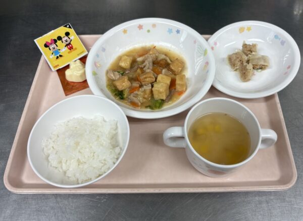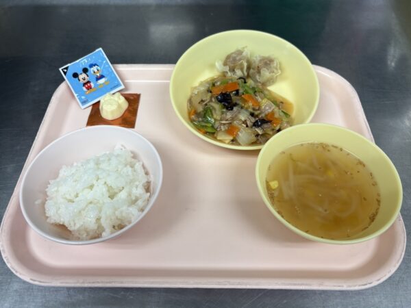今日の給食は、ごはん・もやしとコーンのスープ(もやし、コーン、いりごま)・八宝菜(未満児さんは中華煮)・しゅうまい・ディズニーチーズです。