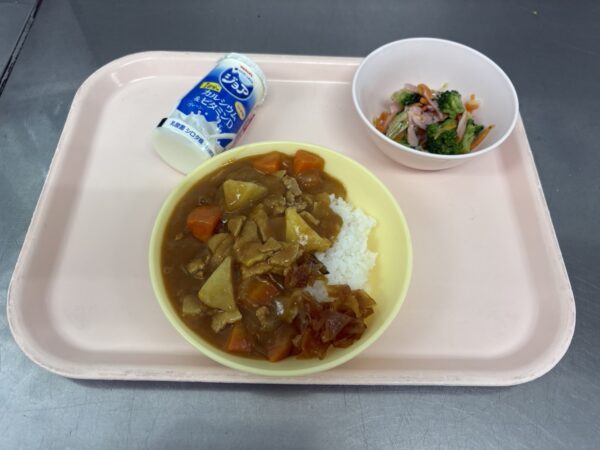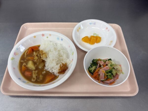 今日の給食は、ポークカレー・ハムサラダ・ジョア(未満児さんはオレンジ)です。