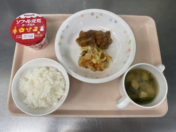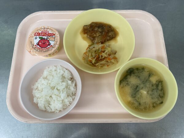 今日の給食は、ごはん・みそ汁(わかめ、豆腐)・白身魚の和風揚げ煮・ちくわ和え・フルーツゼリー(未満児さんは鉄分ヨーグルト)です。