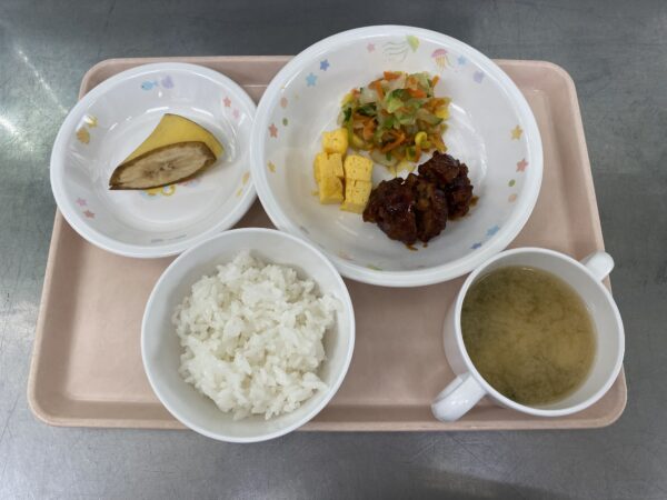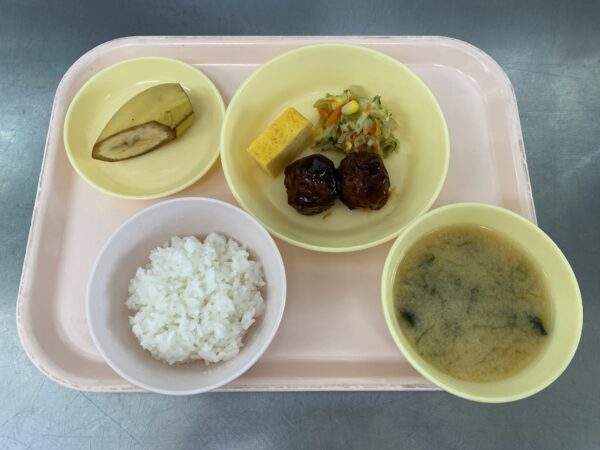 肉団子・玉子焼き 今日の給食は、ごはん・みそ汁(じゃが芋、わかめ)・肉団子・玉子焼き・コーンサラダ・バナナです。 【以上児さん】 【未満児さん】 にじくみさんの午後の手作りおやつは、かぼちゃプリンです🍮