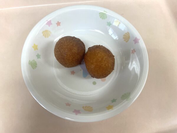 未満児さんの午後の手作りおやつは、かぼちゃドーナツです。
