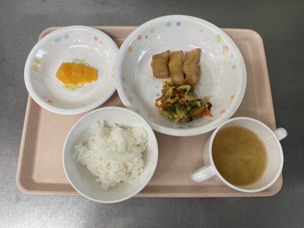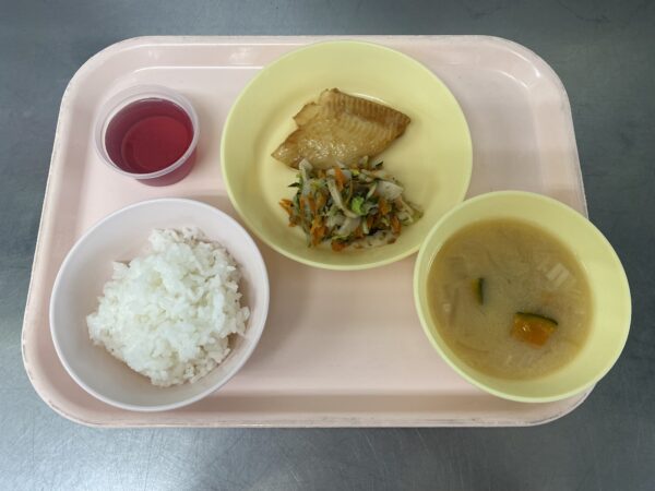今日の給食は、ごはん・みそ汁(かぼちゃ、玉ねぎ、えのき)・カレイの照り焼き・海苔和え・ぶどうゼリー(未満児さんはオレンジ)です。