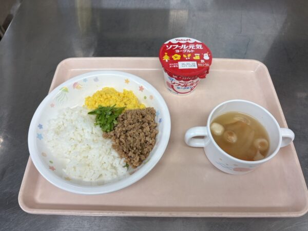 未満児さんの今日の給食は、二色丼・具だくさんみそ汁(人参、玉ねぎ、さつま揚げ、豆麩)・鉄分ヨーグルトです。