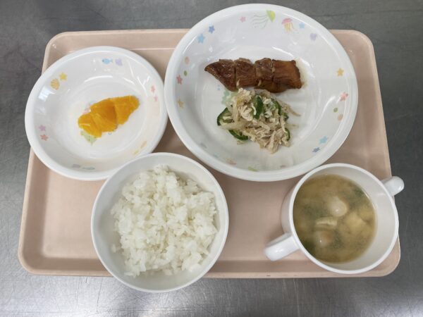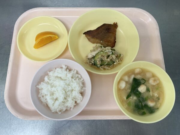 今日の給食は、ごはん・みそ汁(油揚げ、小松菜、豆麩)・赤魚の幽庵焼き・バンバンジーサラダ・オレンジです。