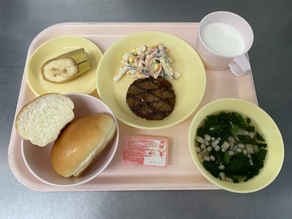 今日の給食は、ロールパン(りんご&マーガリン)・ポテトスープ(じゃが芋、えのき、ほうれん草)・網焼きハンバーグ・マカロニサラダ・バナナ・牛乳です。