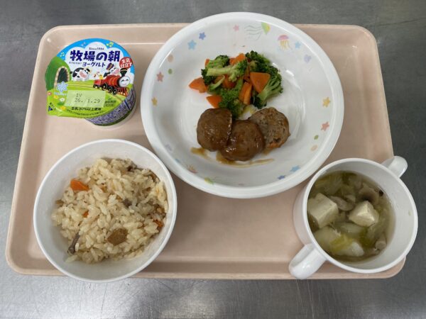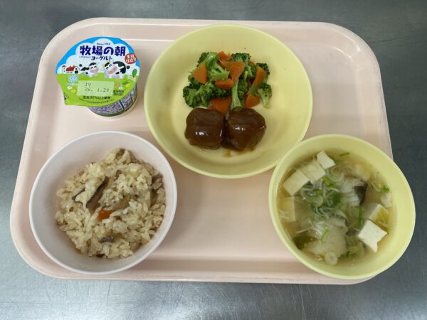 今日の給食は、炊き込みごはん・タラ汁(タラ、白菜、しめじ、豆腐、ねぎ)・肉団子・おかか和え・ヨーグルトです。
