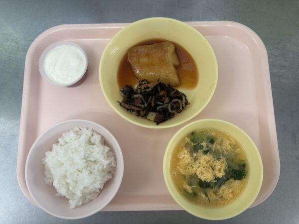 今日の給食は、ごはん・かき玉汁(卵、玉ねぎ、小松菜)・カレイの照り焼き・ひじきの煮物・ぶどうゼリーヨーグルトのせ(未満児さんはヨーグルト)です。