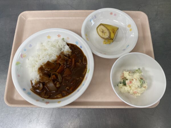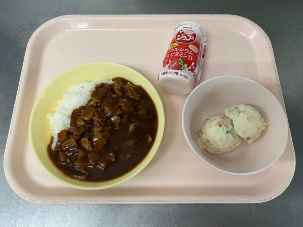 今日の給食は、ハヤシライス・ポテトチーズサラダ・ジョア(未満児さんはバナナ)です。