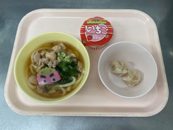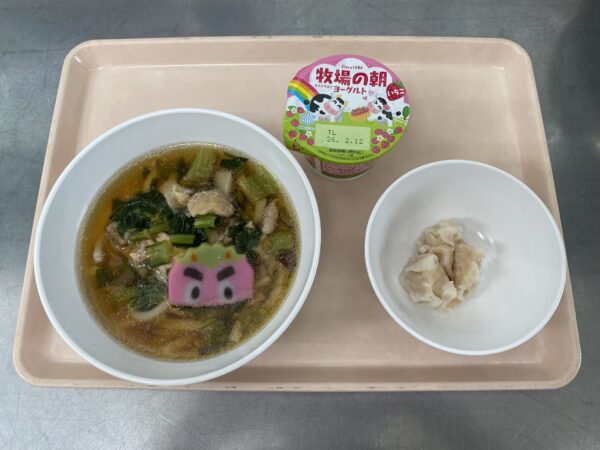 今日の給食は、節分かしわうどん・えびしゅうまい・豆乳クリームプリン(いちご)です👹