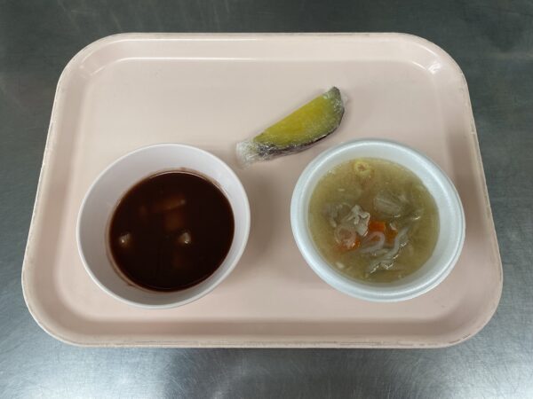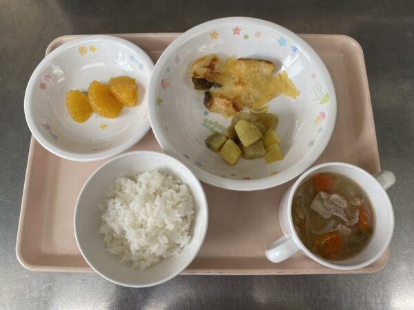 未満児さんの今日の給食は、ごはん・豚汁(豚肉、大根、人参、ごぼう、ねぎ、糸こんにゃく)・タラのチーズ焼き・さつま芋の甘煮・甘夏缶です。