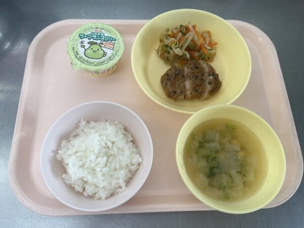 今日の給食は、ごはん・みそ汁(大根、大根葉、高野豆腐)・若鶏のごま照り焼き・もやしナムル・フルーツゼリー(未満児さんは鉄分ヨーグルト)です。
