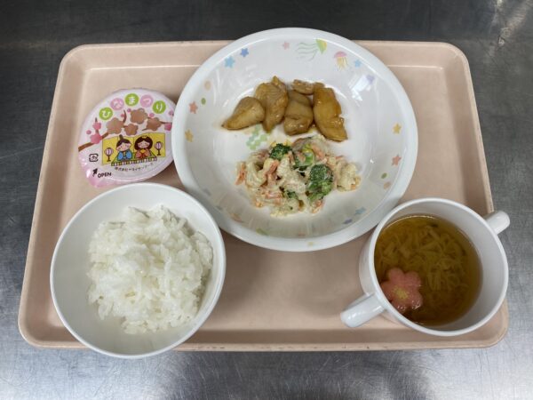 ごはん・すまし汁(花型麩、えのき、長ねぎ)・カレイの照り焼き・和風マヨサラダ・桃の花三色ゼリーです。