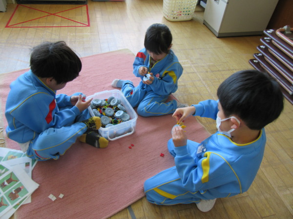 お部屋では、年長になって初めて遊ぶ遊具が大人気!ラキューや3Dパズルを友達と一緒に楽しんでいます。組み立てが難しいものもありますが、考えながら遊んでいますよ!