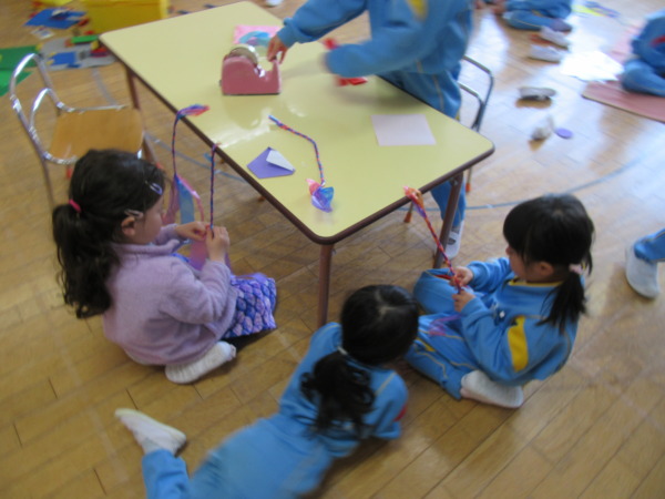 製作ではすずらんテープを使って、三つ編みをして遊んでいます。髪の毛につけてお姫様になっている女の子もいます♡