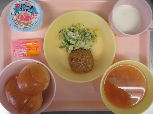 今日の給食は、バターロール・ミネストローネ・チーズインハンバーグ・コールスローサラダ・ももゼリー・牛乳です。