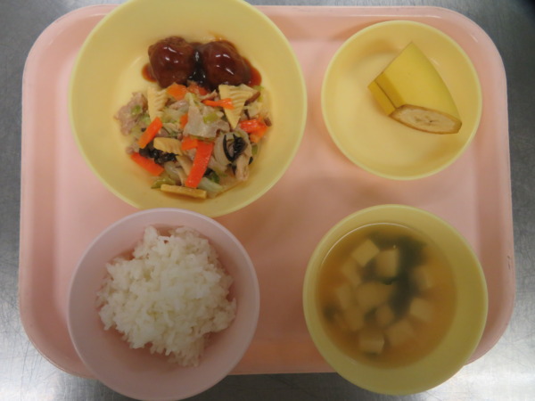 今日の給食は、ごはん・中華スープ・八宝菜・肉団子・バナナです。