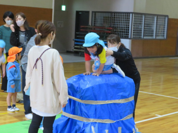 先生達が準備をした、アスレチックに挑戦しました。8つのコーナーをおうちの人や友達と一緒に回って嬉しそうな子ども達でした💕