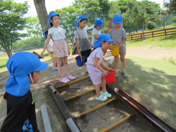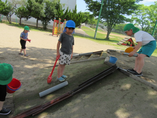 坂に樋やパイプを並べて水を流したり、穴を掘って水を入れて湖のようにしたりして遊んでいましたよ♪