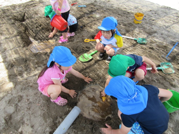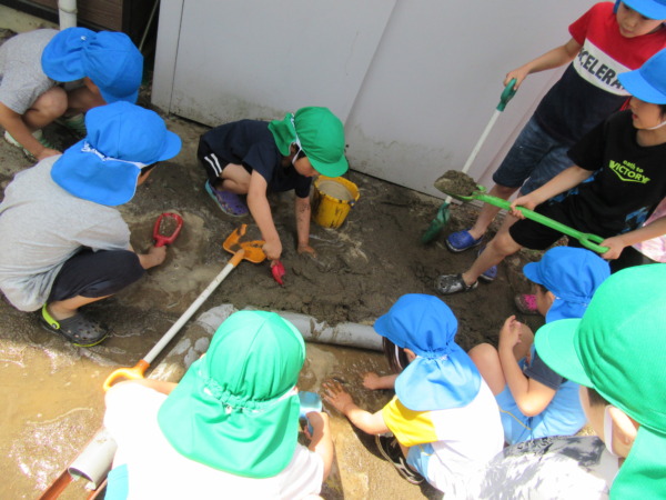 今日は天気が良かったので、年長さんになって初めての泥遊びをしました!