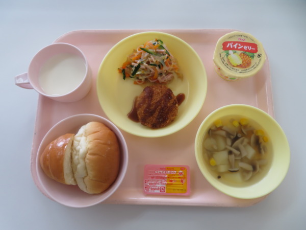 今日の給食は、バターロール・コンソメスープ・キャベツメンチカツ・春雨サラダ・牛乳・パインゼリーです。