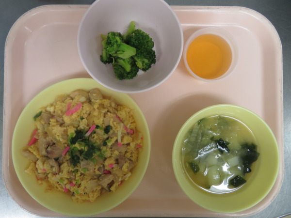 今日の給食は、親子丼・みそ汁・ブロッコリーのおかか和え・オレンジゼリーです。