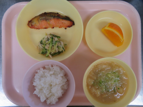 今日の給食は、ごはん・みそ汁・鮭の西京焼き・バンバンジーサラダ・オレンジです。