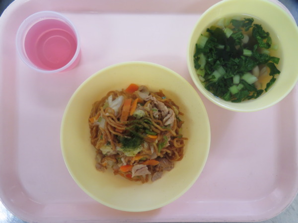 今日の給食は、焼きそば・チンゲン菜のスープ・いちごゼリーです。