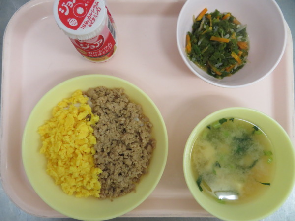 二色丼 今日の給食は、二色丼・みそ汁・めかぶ和え・ジョア(ストロベリー)です。 丼ものは食べやすいようで、もりもり食べてくれました😋 めかぶ和えは好みが分かれますが、気に入った子はおかわりしてくれたようでした💛